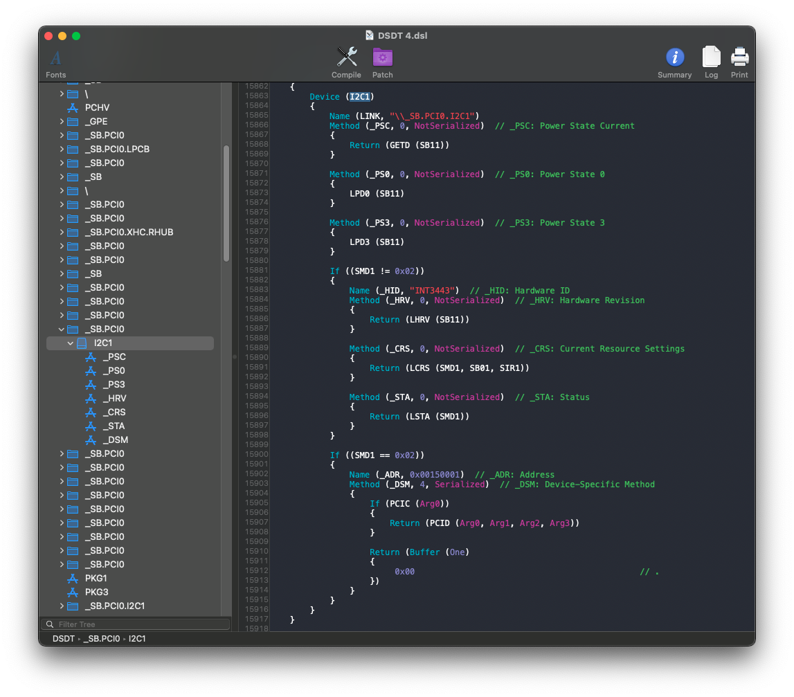 A big part of fixing I2C trackpads is enabling them within ACPI. For VoodooI2C to work, GPI0 needs to be enabled, as well as the Trackpad and I2C bus. The latter two devices are commonly disabled behind an OS check for Windows which need to be patched to work with macOS as well. Often times, GPI0 is already enabled and requires no modification.