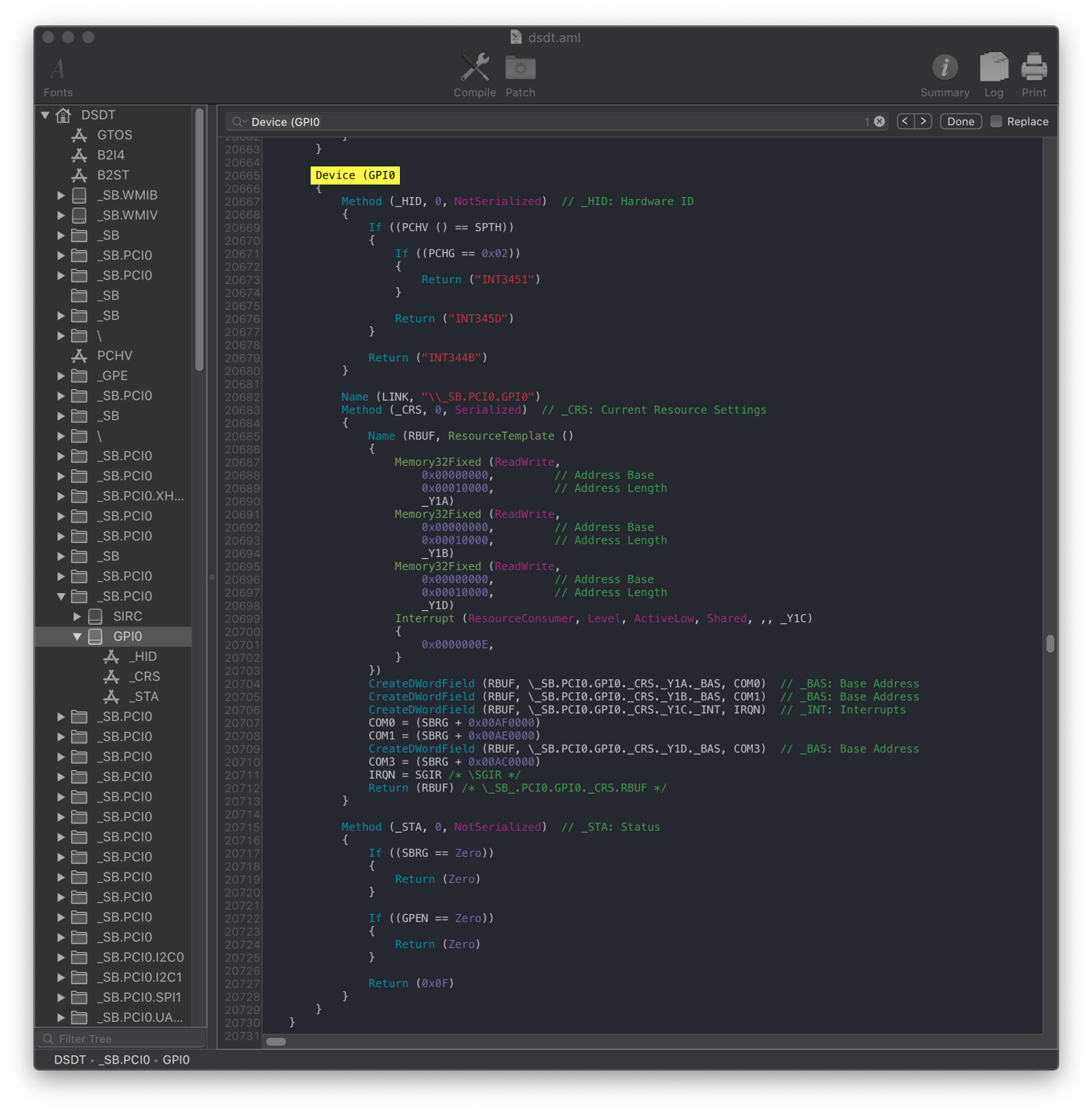 You will want to test the SSDT at this point by compiling the SSDT and adding it to your config.plist. VoodooGPIO should now be attached to the GPI0 device as shown at the top of the GPI0 section. If your trackpad still doesn't work after enabling the GPI0 device, move on to the next section.