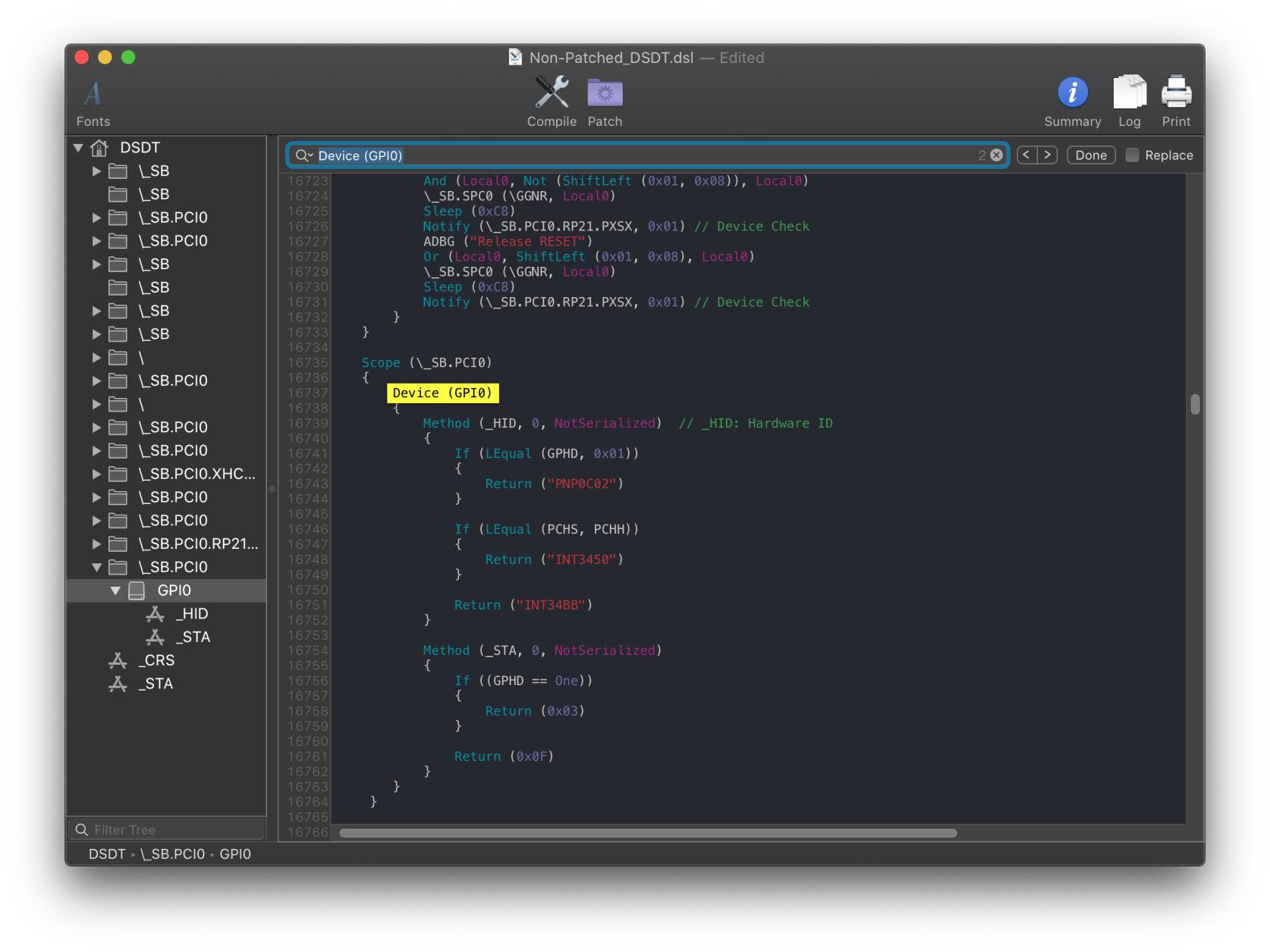 First open your decompiled DSDT you got from Dumping the DSDT and Decompiling and Compiling with either MaciASL (if in macOS) or any other text editor if in Windows or Linux (VSCode has an ACPI extension that can also help).