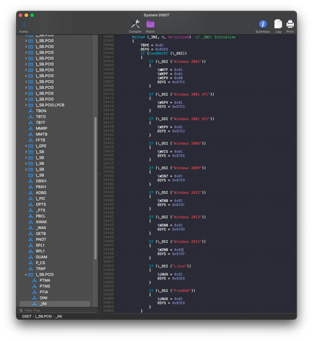 The value OSYS, stores information about the current OS running. We will want to look for any place in which OSYS is set (OSYS = 0x07DC for example). In this DSDT, this is set under \_SB.PCI0._INI as shown below:
