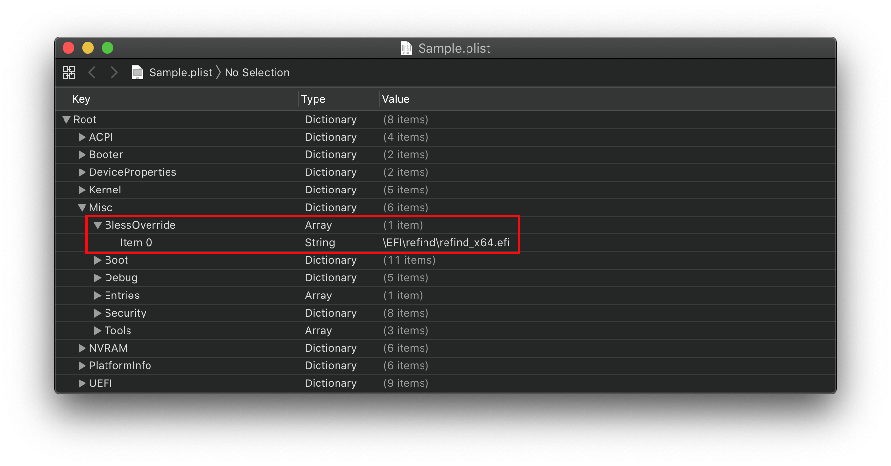 2. Add BlessOverride path for rEFInd(\EFI\refind\refind_x64.efi)
