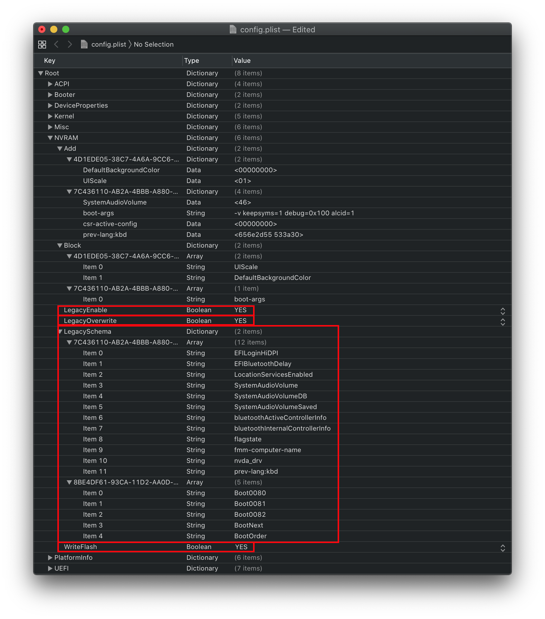 LegacyEnable: set toYESLegacyOverwriteset toYESLegacySchema: NVRAM variables set(OpenCore compares these to the variables present in nvram.plist)WriteFlash: set toYES