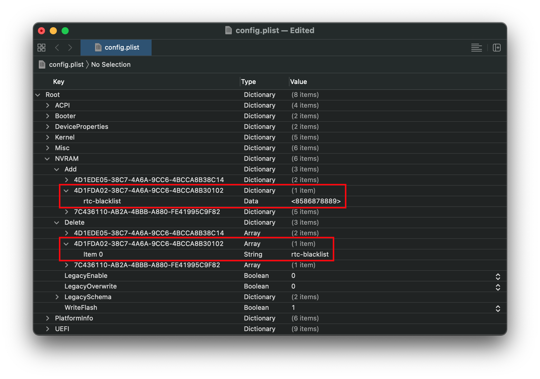 For this, open up your config.plist and head to the NVRAM -> Add section. Here under the 4D1FDA02-38C7-4A6A-9CC6-4BCCA8B30102 GUID, you'll want to add a new entry called rtc-blacklist