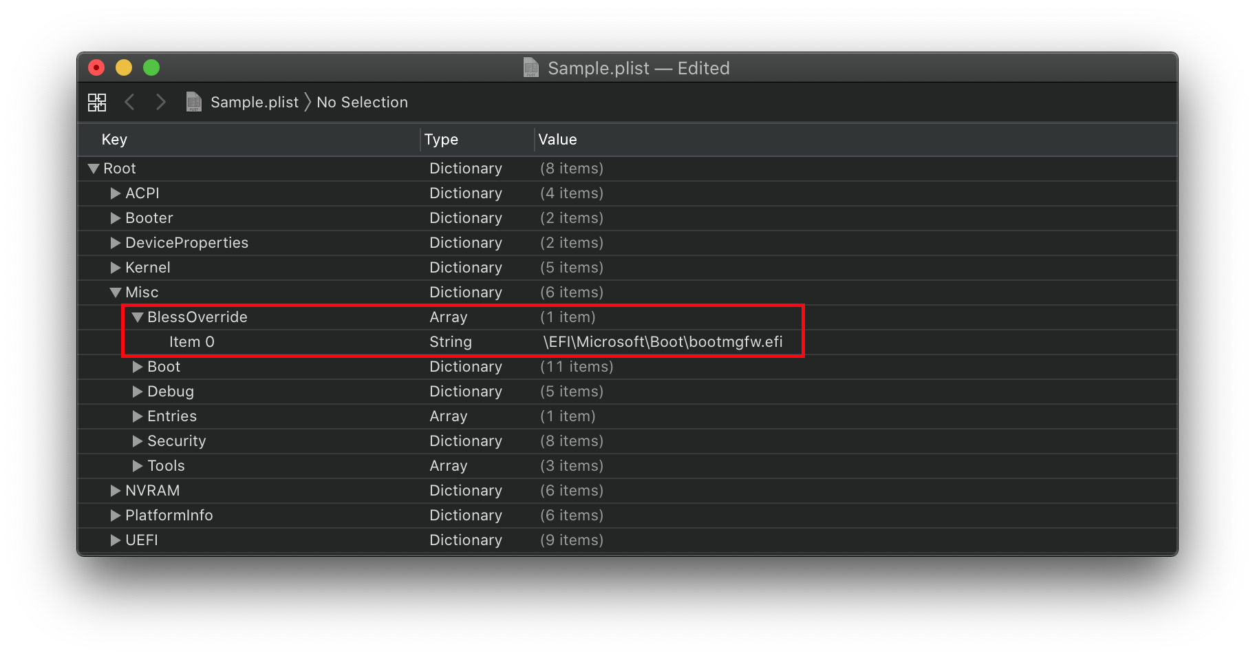 Misc -> BlessOverride -> \EFI\Microsoft\Boot\bootmgfw.efi