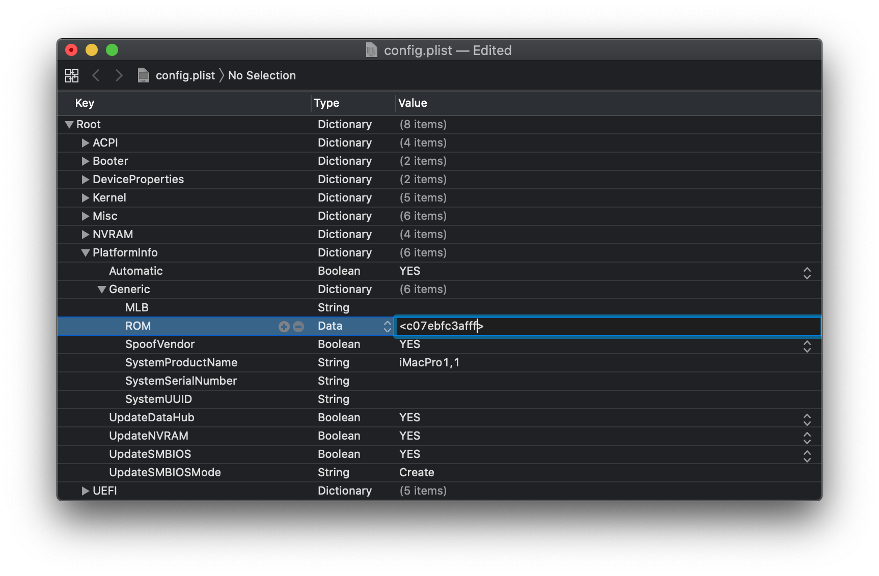 This is a section many may have forgotten about but this is found in your config.plist under PlatformInfo -> generic -> ROM
