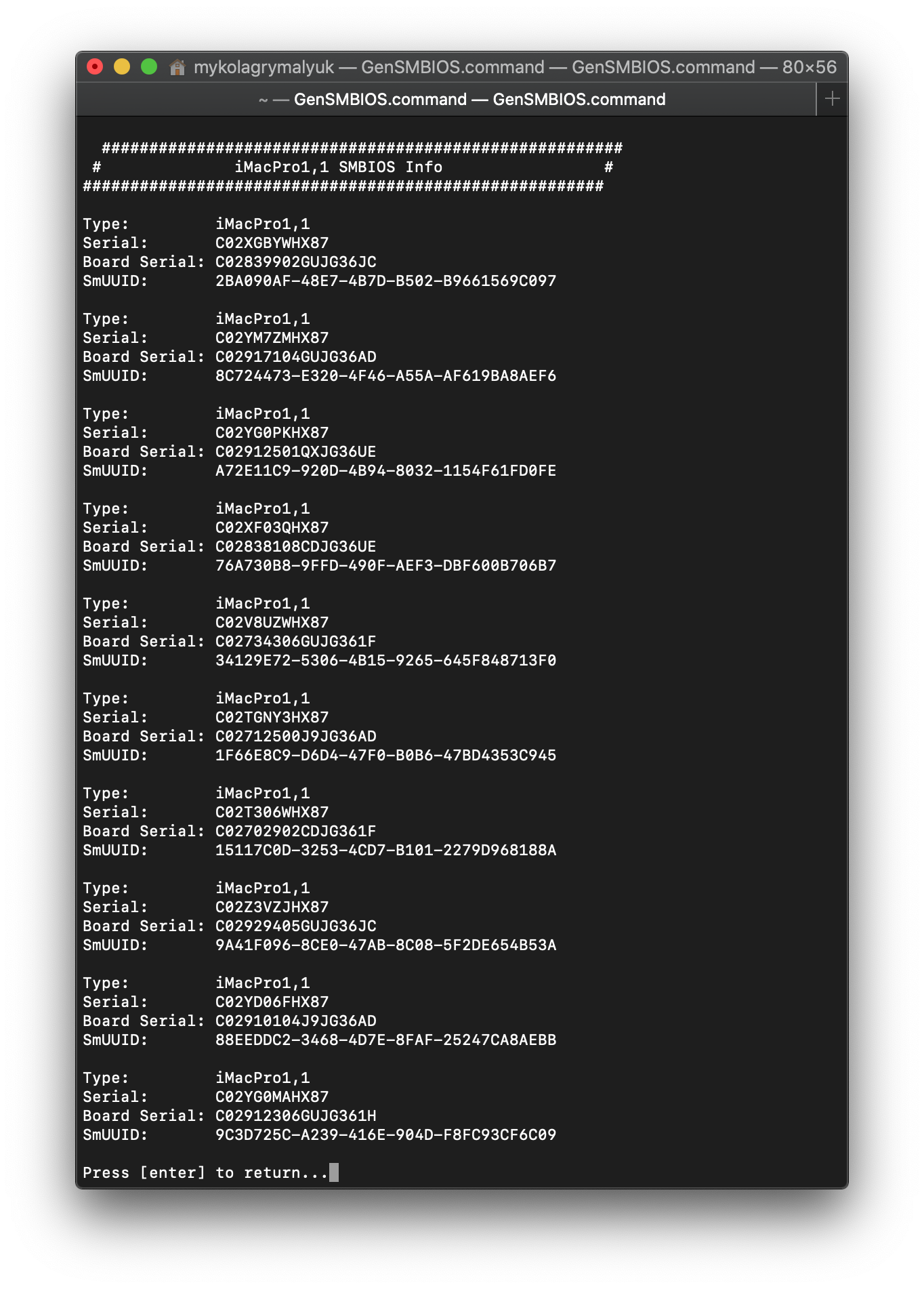 Tip: iMacPro1,1 10 will print 10 serials, this will save you some time on generating