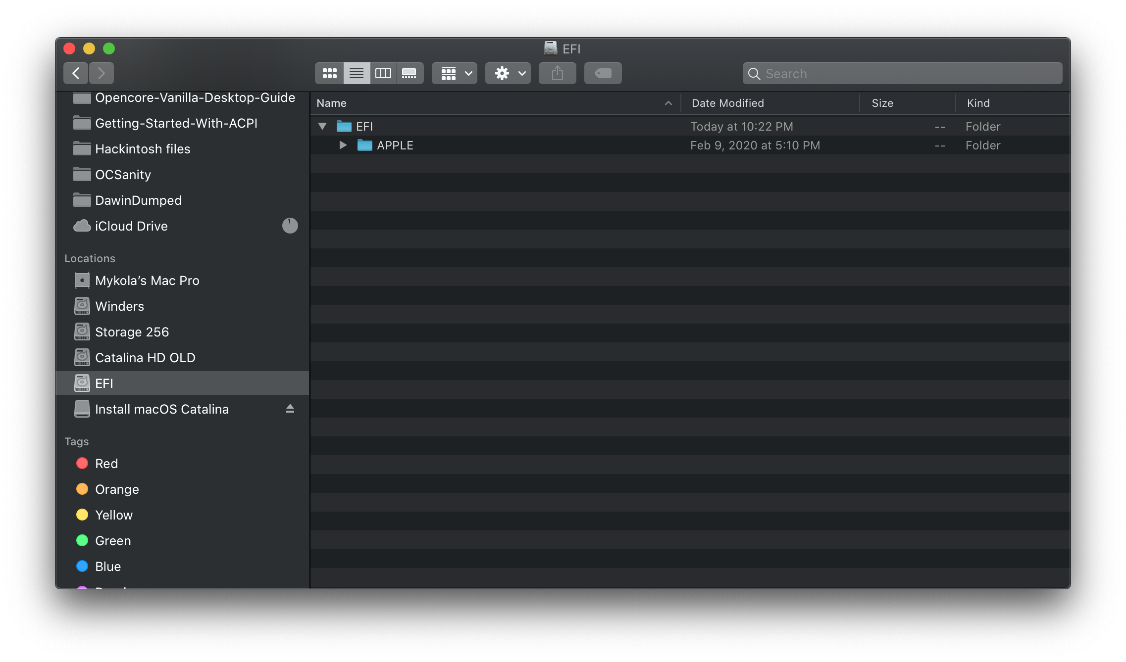 Once the EFI's mounted, we'll want to grab our EFI folder on there and keep in a safe place. We'll then want to eject the USB drive's EFI as having multiple EFI's mounted can confuse macOS sometimes, best practice is to keep only 1 EFI mounted at a time(you can eject just the EFI, the drive itself doesn't need to be removed)