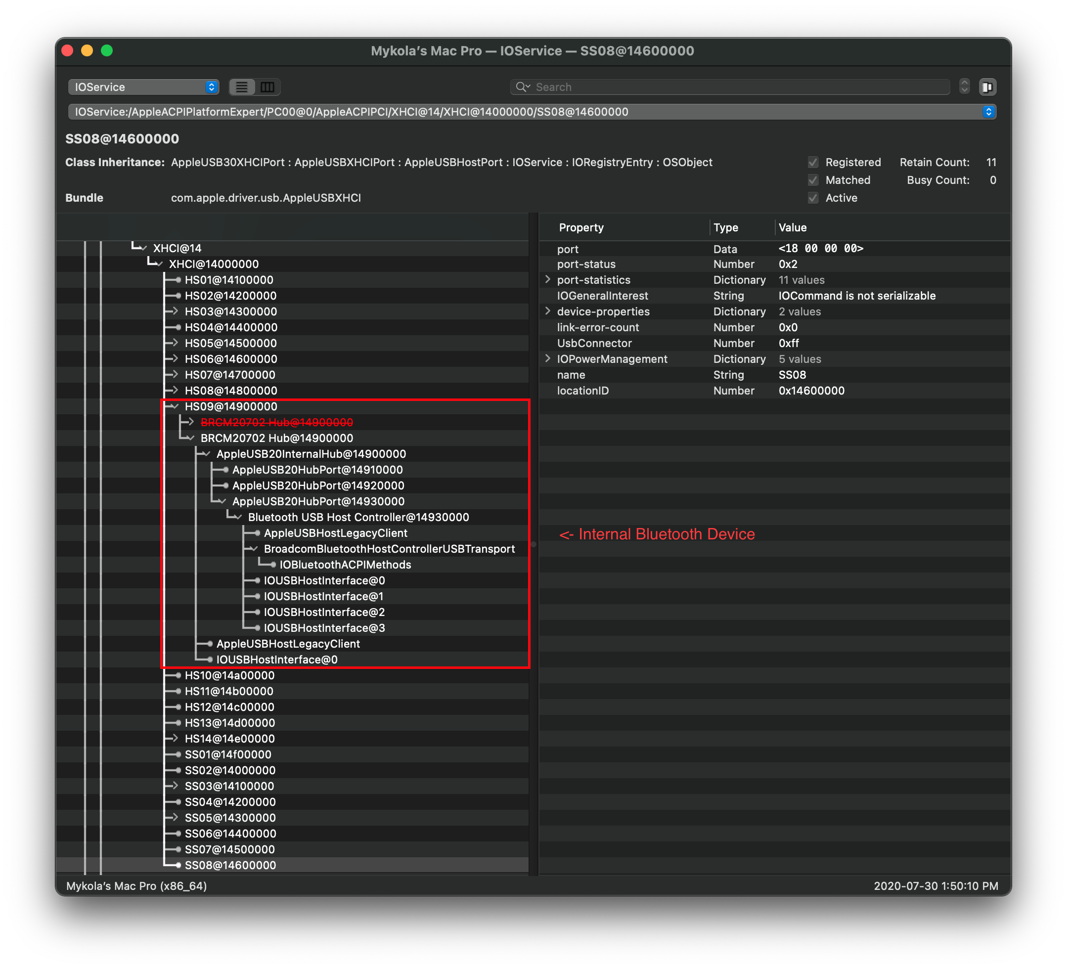 So while not obvious to many, Bluetooth actually runs over the USB interface internally. This means that when mapping, you'll need to pay close attention to devices that already show up in IOReg: