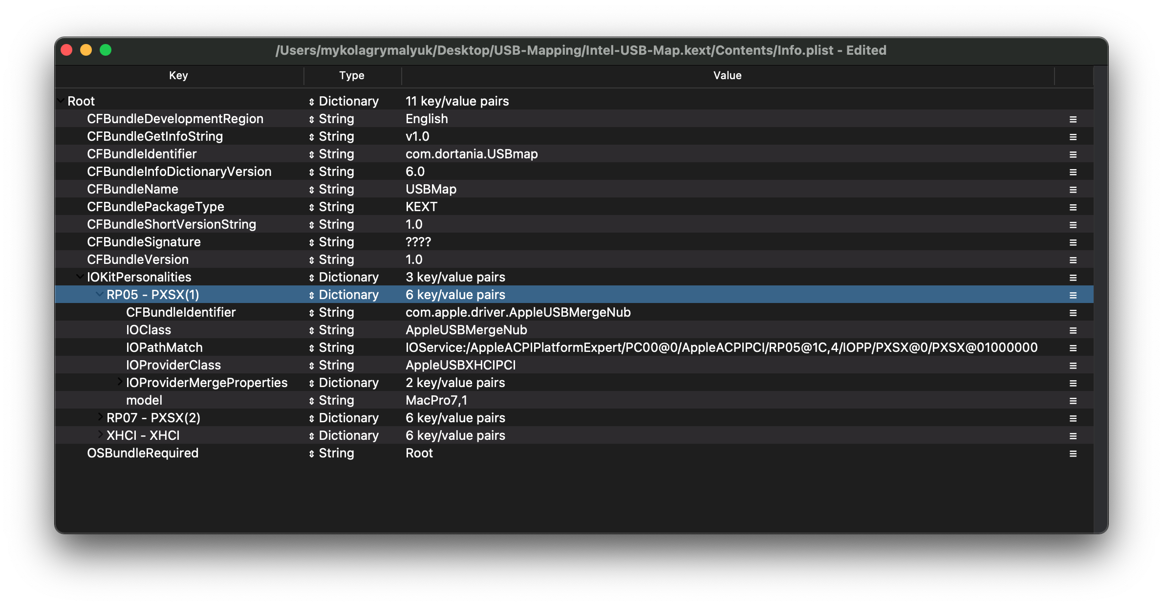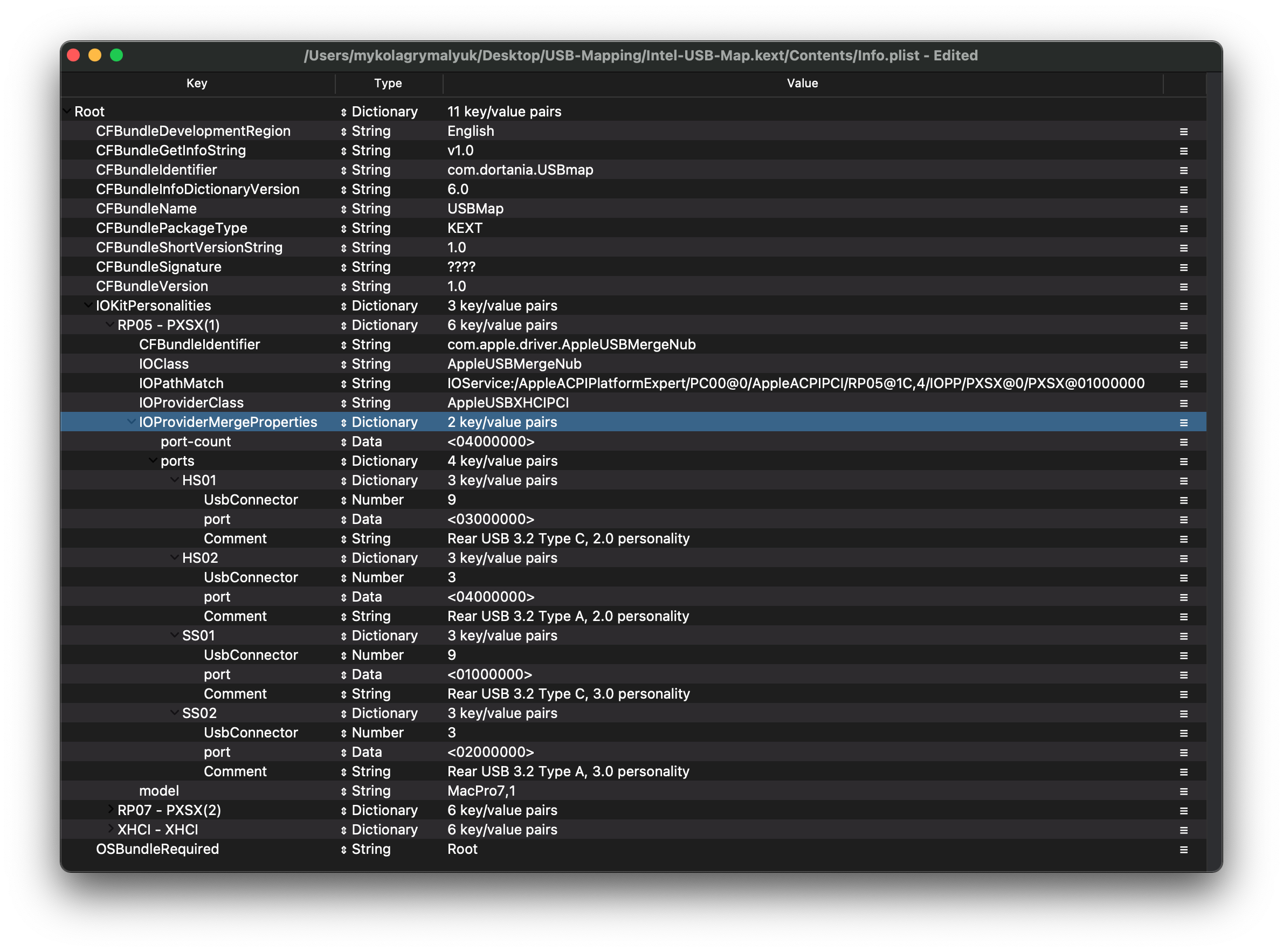 Finding IOProviderClass is also easy, select the Root-hub once again and look for the CFBundleIdentifier value: