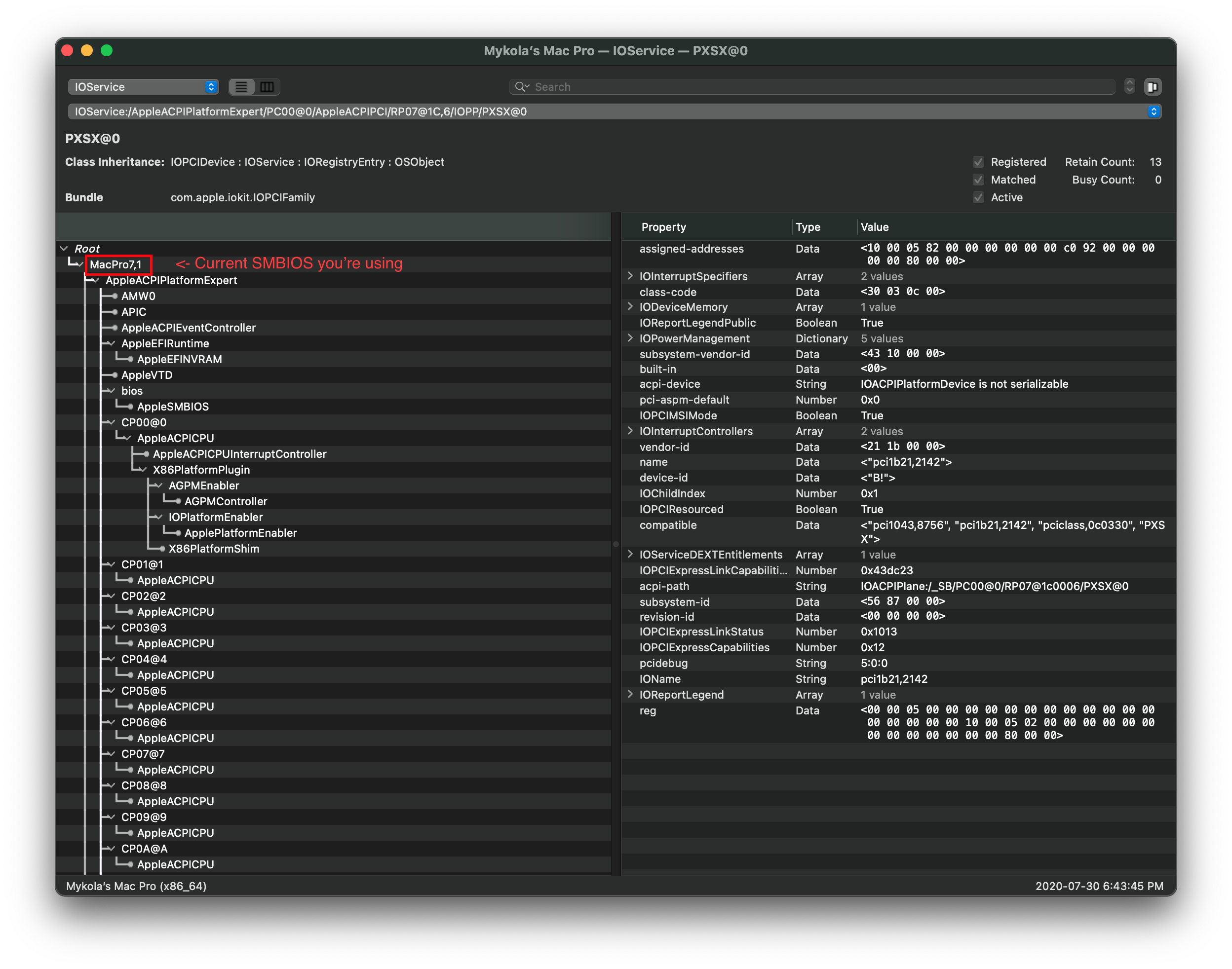 If you've forgotten what SMBIOS you're using, you can simply check the top level device in IOReg: