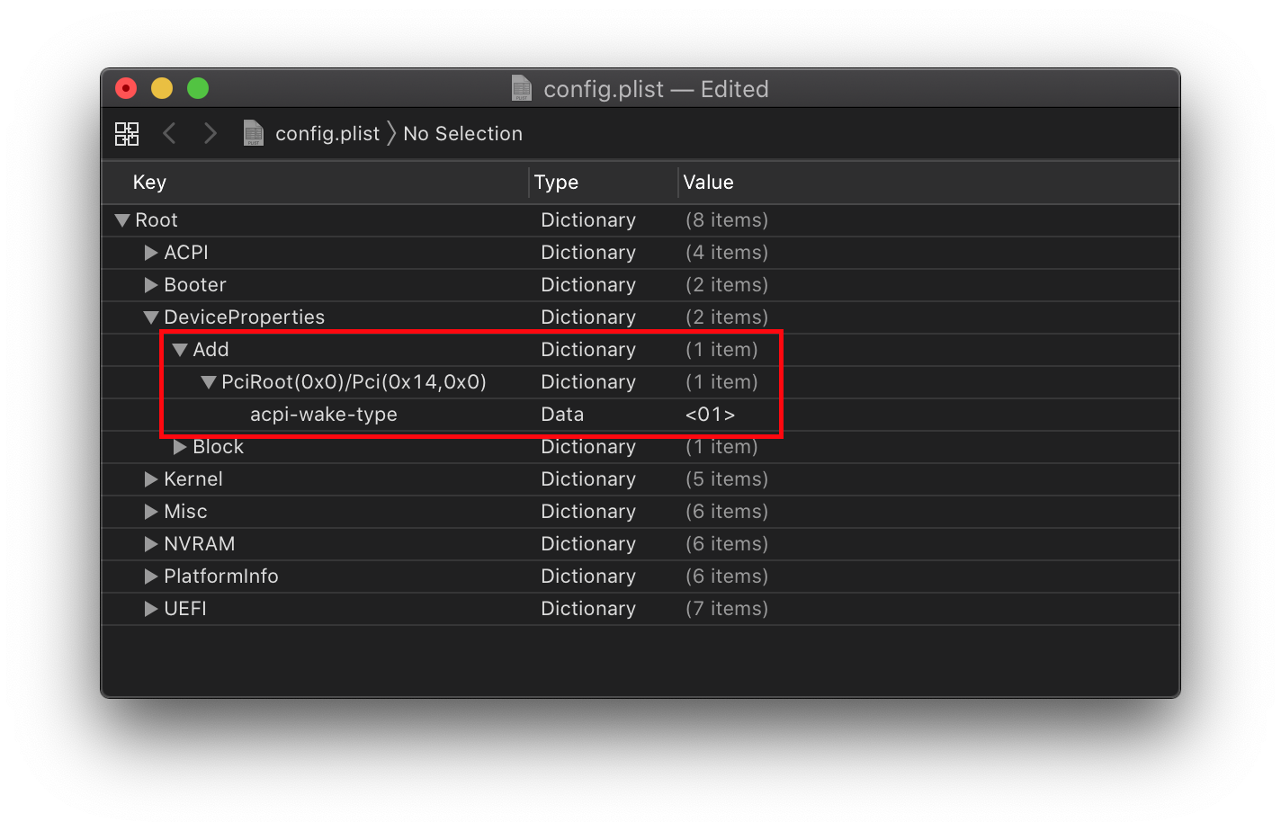 So the ideal method is to declare the XHCI Controller(This is our USB Controller) to be an ACPI wake device, as we don't have compatible ECs for macOS to handle proper wake calls.