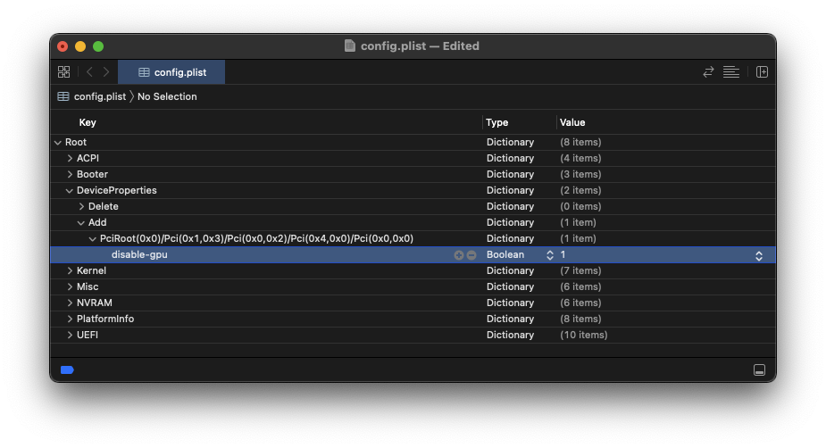 Con questo, naviga attraverso Root -> DeviceProperties -> Add e aggiungi il tuo percorso PCI con le seguenti proprietà: