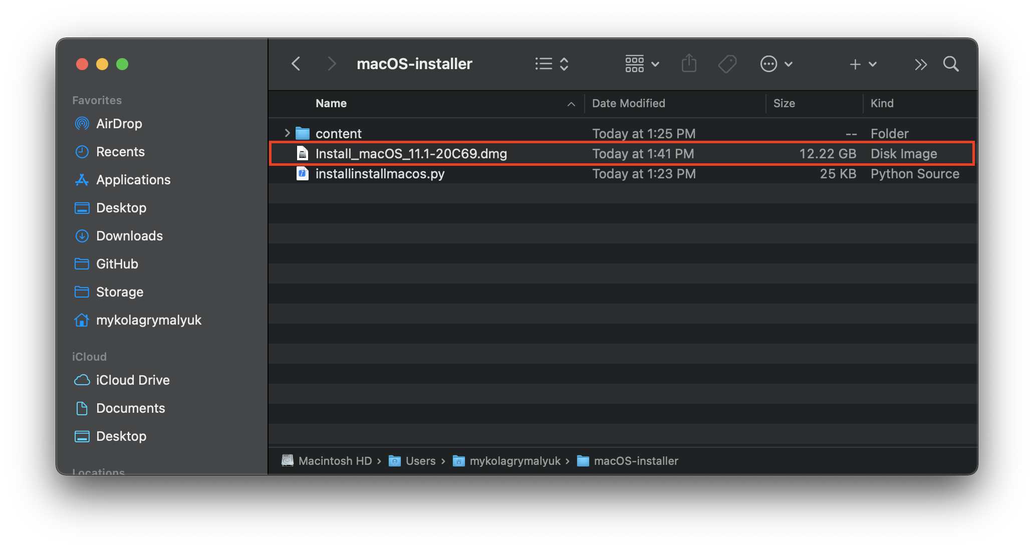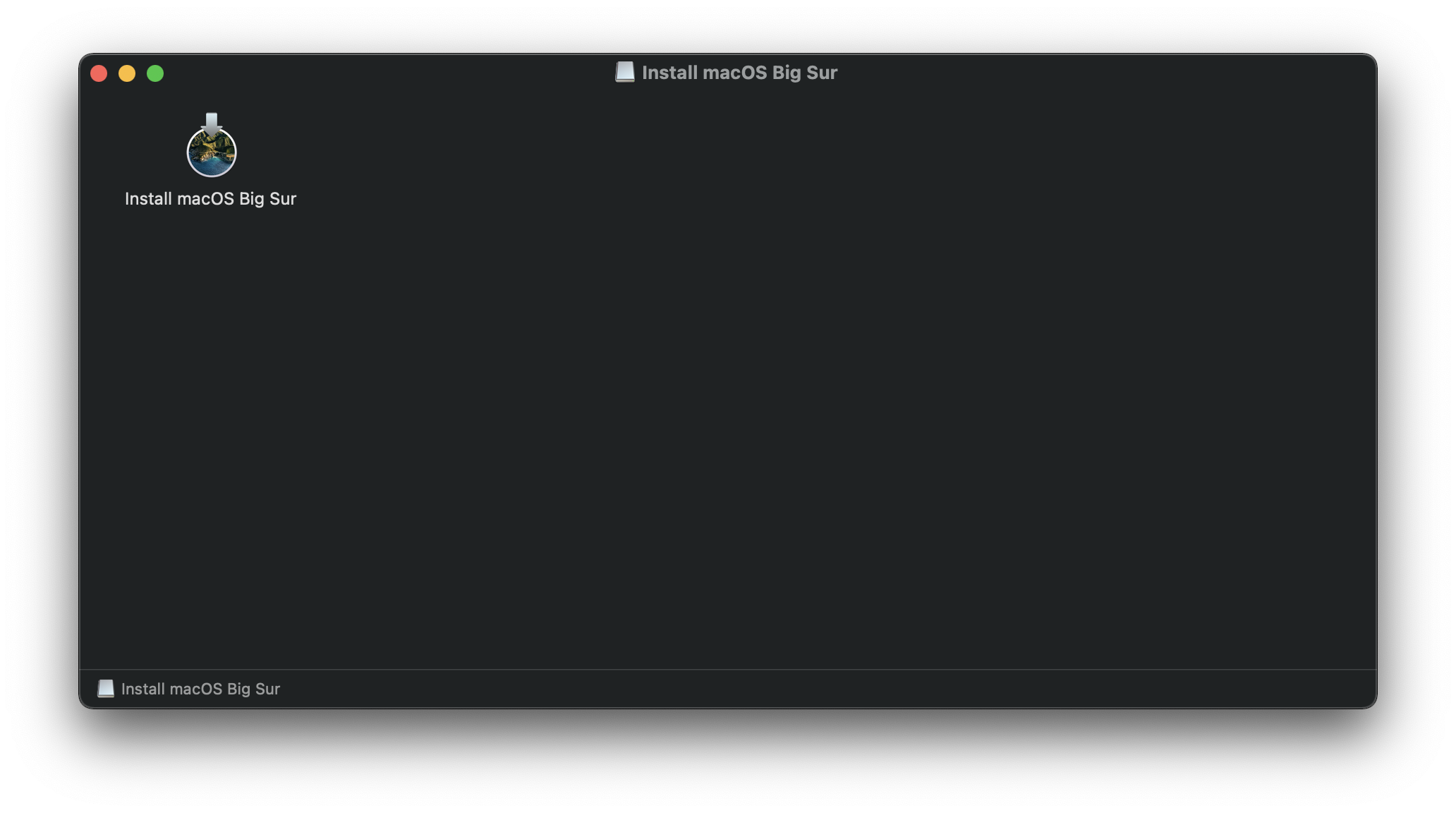 Una volta finito, troverai nella cartella ~/macOS-Installer/ un DMG contenente l'installer di macOS, chiamato Install_macOS_11.1-20C69.dmg, per esempio. Montalo e troverai l'applicazione installer.