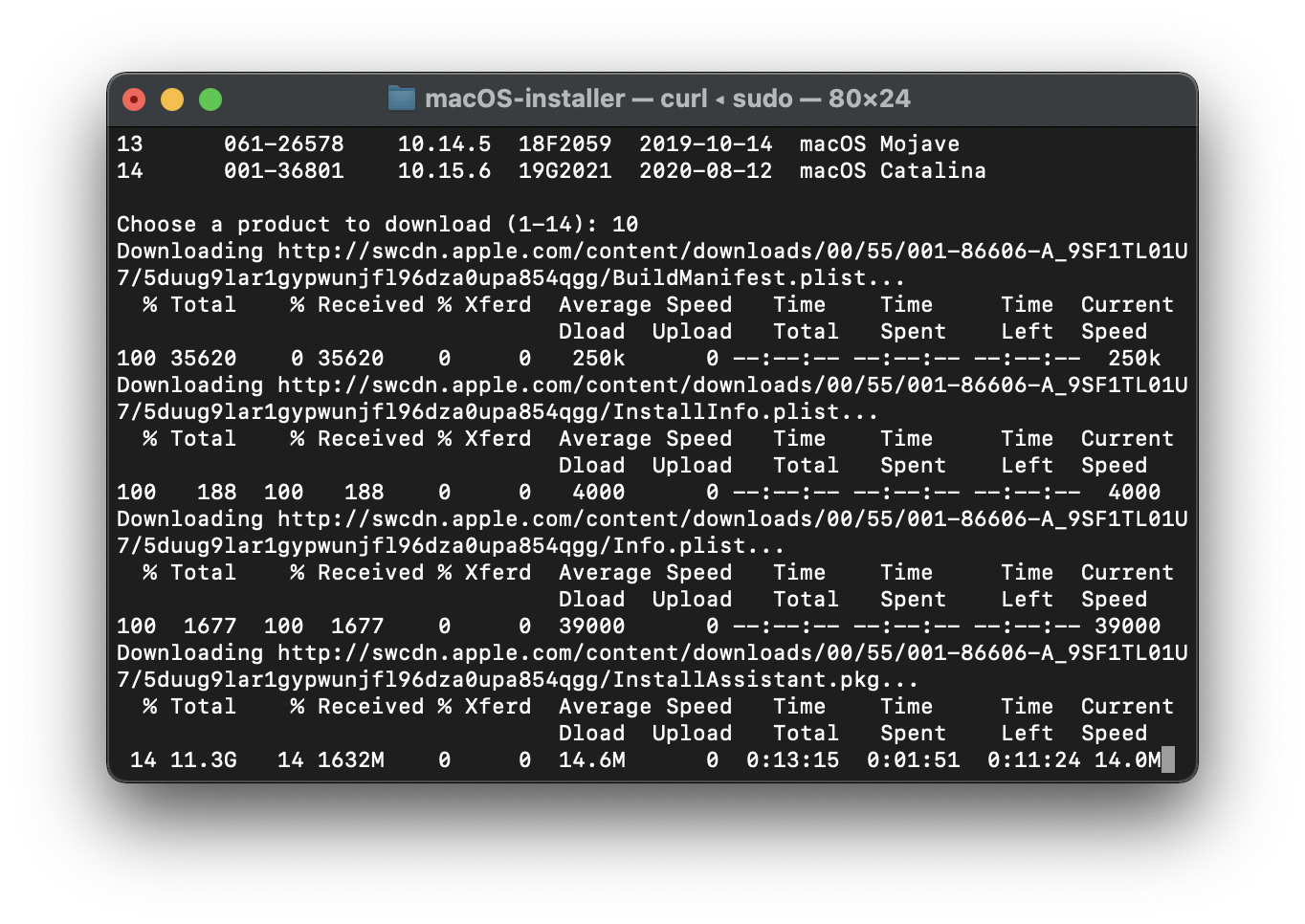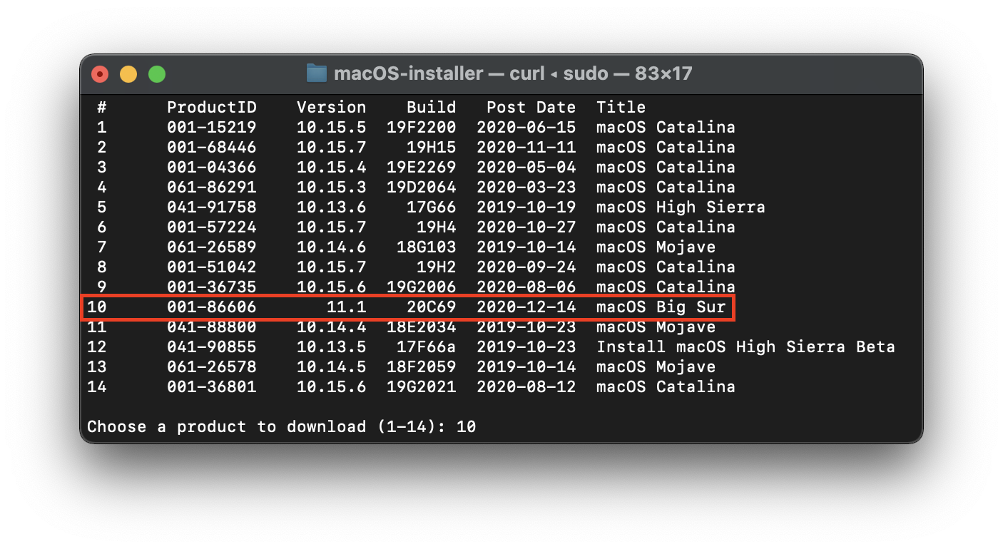 Come vedi, otterrai una lista di 10 installer di macOS. Se hai bisogno di una particolare versione di macOS, selezionala digitando il numero accanto ad essa. Nell'esempio sceglieremo il 10: